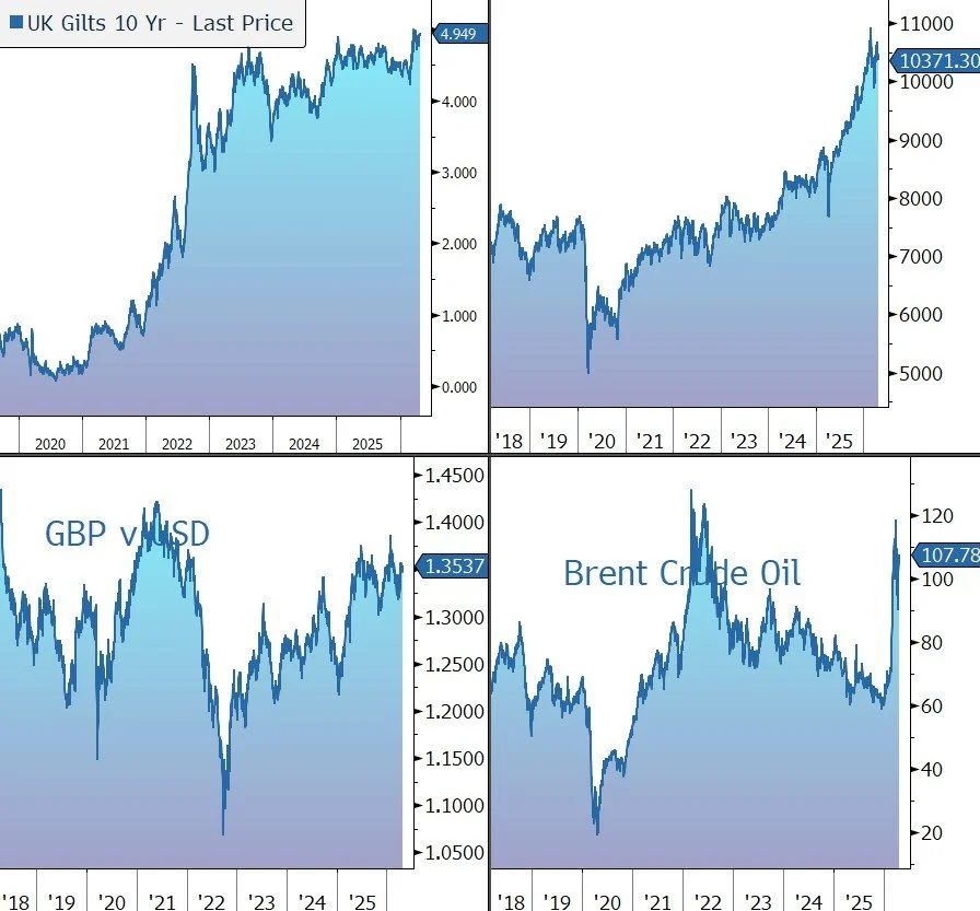 Brent Crude currently trades just above $107 a barrel. Persian Gulf crude output is 57% below pre-war levels. Goldman has raised its oil forecasts, seeing Brent at $90 in the fourth quarter, as Hormuz disruptions drive an estimated 9.6m b/d deficit this quarter. Gold ticked up $4,715 an ounce.