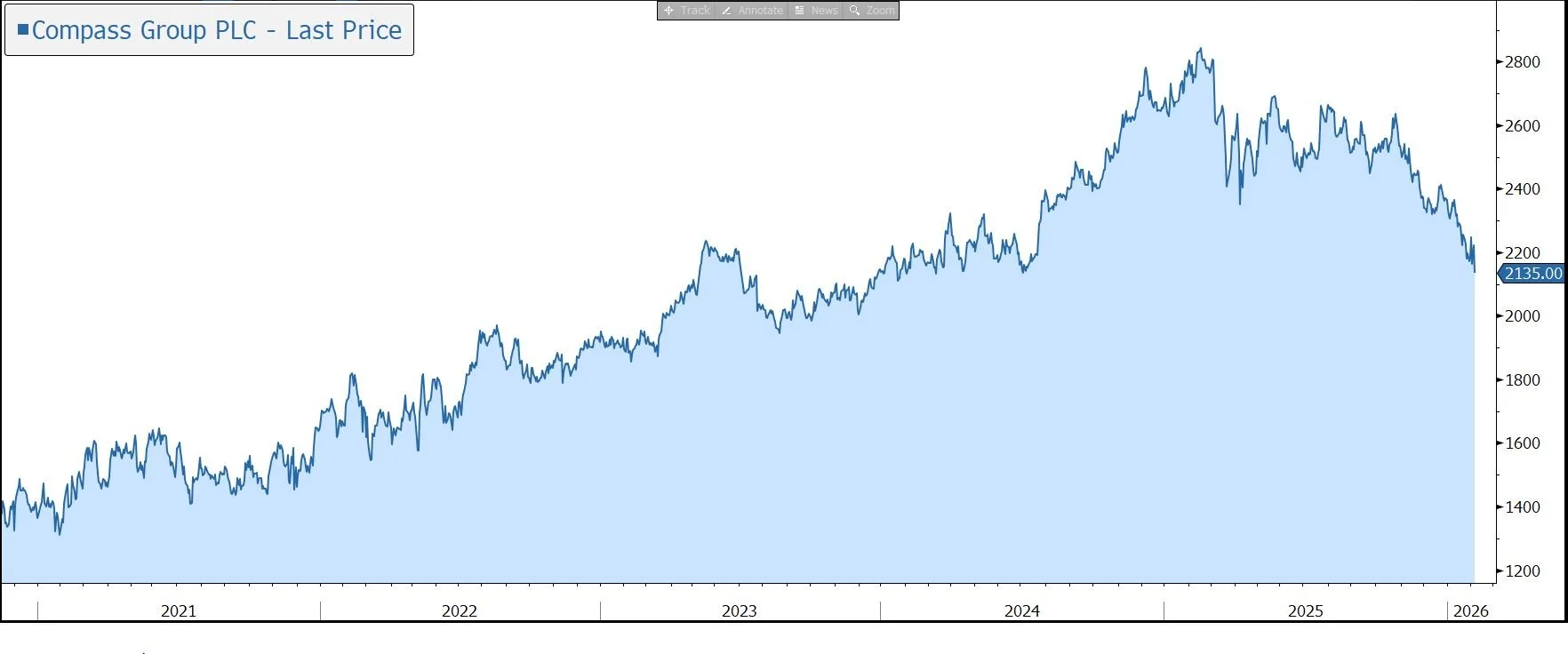 Compass has reiterated its guidance for FY2026 – it expects constant currency underlying operating profit growth of around 10%, driven by organic revenue growth of around 7%, around 2% profit growth from M&A (including Vermaat), and ongoing margin progression. Although the revenue target appears conservative, the company does face some tough year-on-year comparatives in FY2026.
