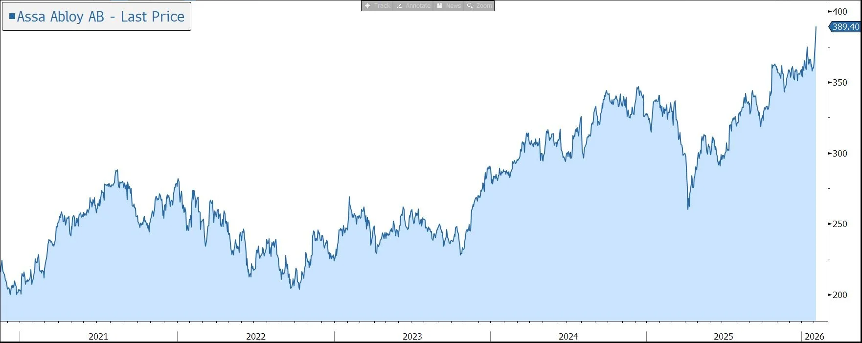 Assa Abloy is a textbook example of late cycle business – locks are the last thing in a building and are changed when you’ve moved. In 2025, the macroeconomic environment was mixed, especially in the residential market that accounts for a third of sales. However, strong exposure to the aftermarket and operational agility continue to be a great advantage.