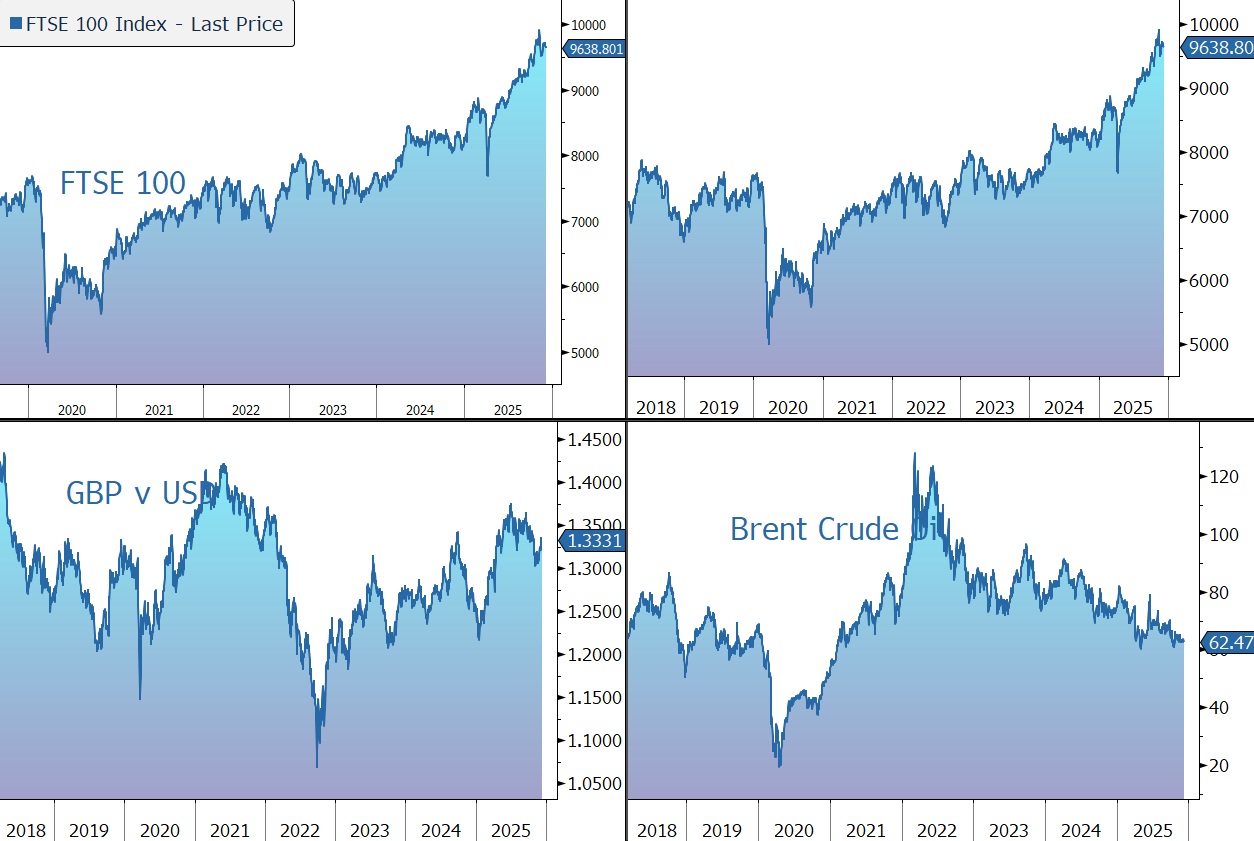The FTSE 100 is currently little changed at 9,639, while Sterling trades at $1.3345 and €1.1460. UK retail sales rose 1.4% year on year in November, the smallest gain in six months, the BRC said. The Bank of England still has its “foot on the brake a little bit” with monetary policy even as UK price and wage pressures continue to cool, according to rate-setter Alan Taylor.
