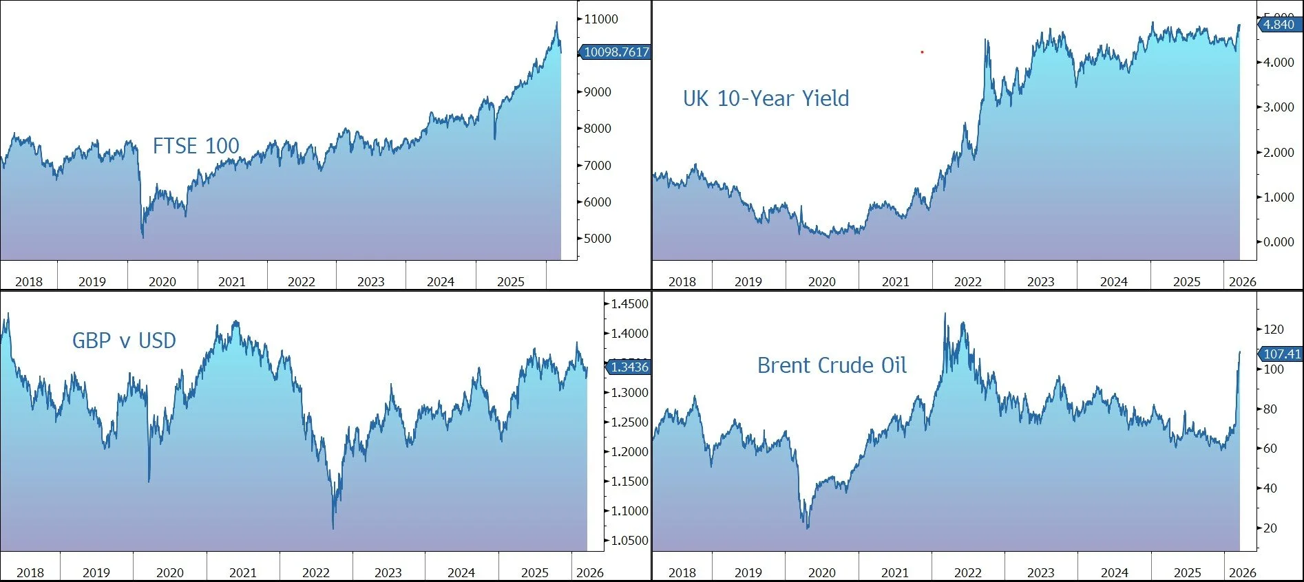 The FTSE 100 is currently 0.3% higher at 10,098, while Sterling trades at $1.3410 and €1.1595. The UK 10-year gilt yield climbed above 4.8%, reaching its highest level since September 2025, after the Bank of England unanimously voted to hold rates at 3.75%, a more hawkish stance than expected. Markets had anticipated a 7-2 split in favour of steady rates, but policymakers highlighted concerns over surging global energy and commodity prices.