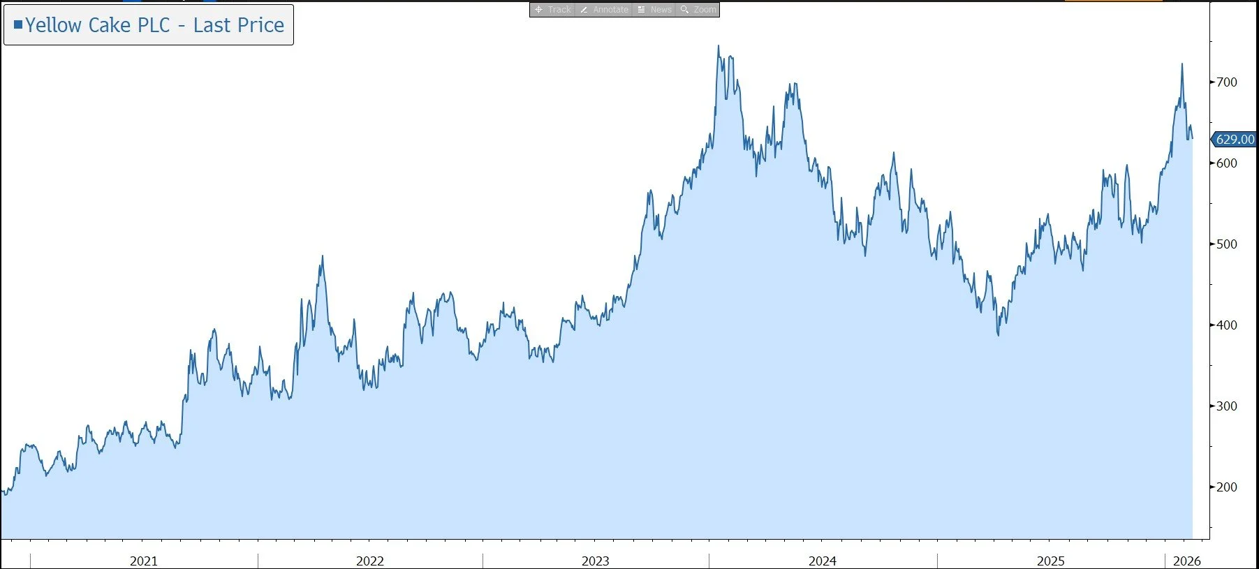 For Yellow Cake, the estimated NAV on 12 February was 650p per share, based on 23.01m pounds uranium valued at a spot price of $89/lb and cash & other current assets and liabilities of $77.1m. The shares currently trading on a slight discount to NAV.