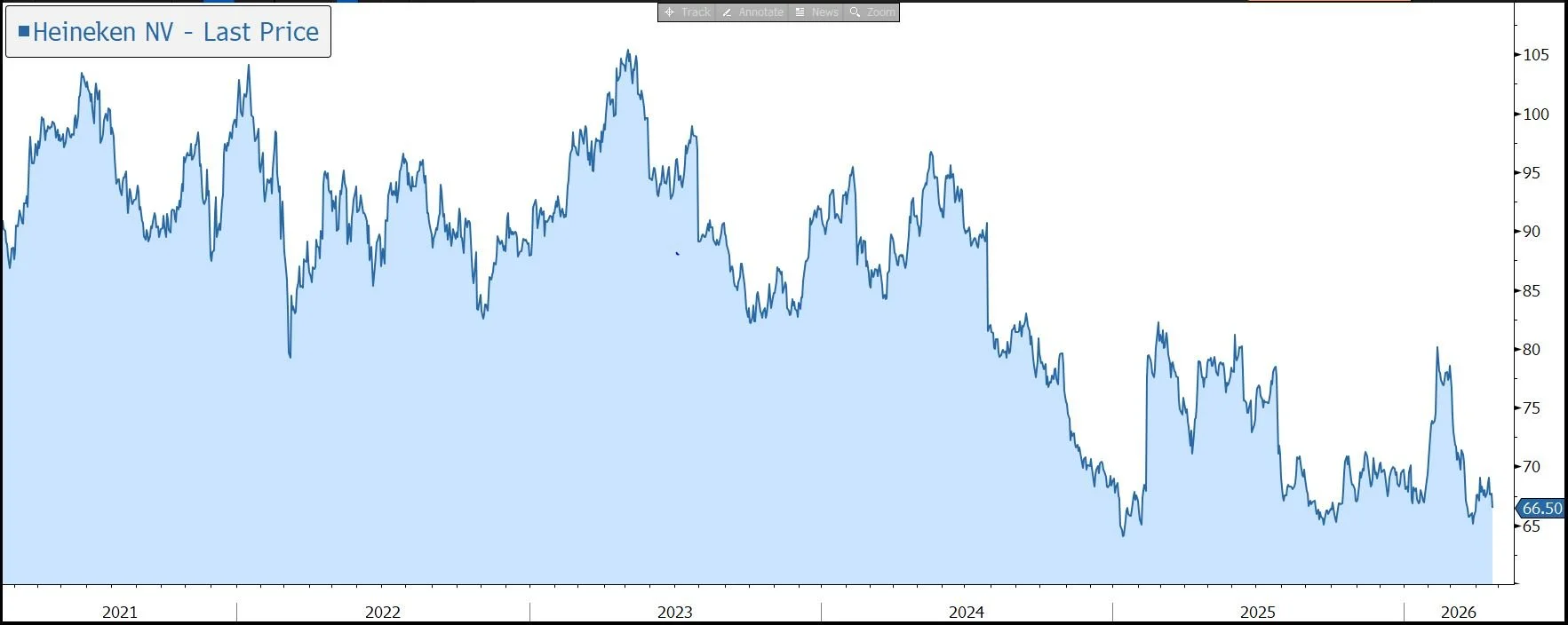 During the quarter the company accelerated its EverGreen 2030 strategy and is on track to deliver its €500m target for 2026. As is usual at this stage, there is no other update on the group’s profitability or financial position, although we would highlight Heineken has a strong balance sheet. At the end of 2025, financial gearing was 2.2x net debt to EBITDA, below the long-term target to be below 2.5x. The company’s dividend policy is to pay out 30%-50% of full-year net profit – the 2025 payment was up 2.2% to €1.90 (2.5% yield).