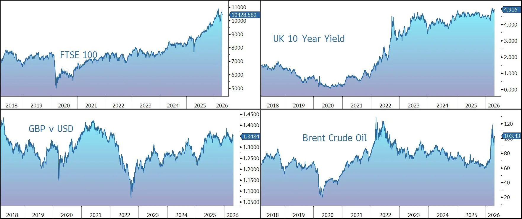 Brent crude climbed 1% to $103 a barrel, putting it on track for a fourth straight day of gains. Bonds fell on inflation concerns – the yield on the US 10-year Treasury ticked up to 4.31%. Gold slipped to $4,720 an ounce.